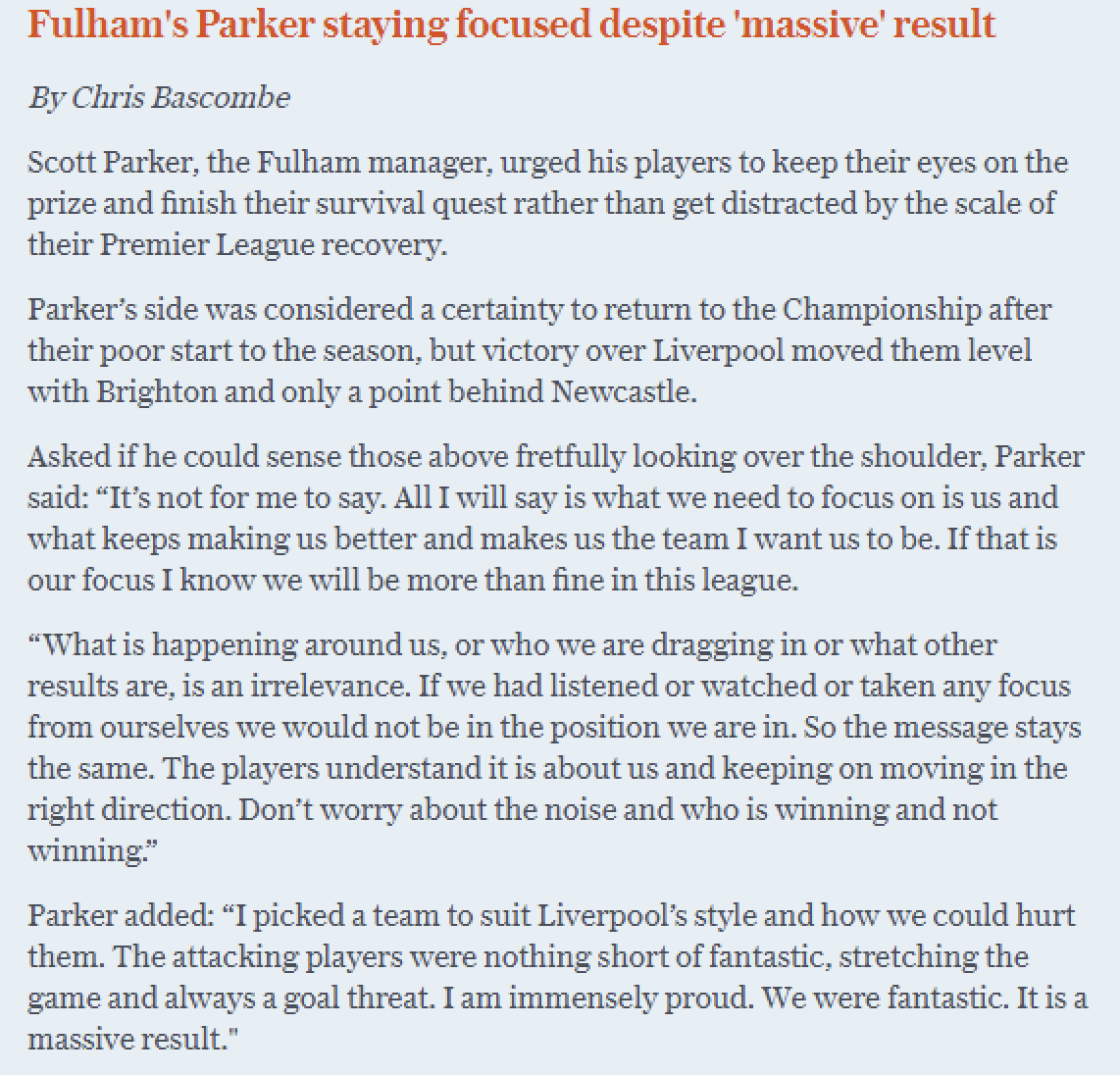 That was the message, scott parker speaks about coming. In the end we don't score goals and that's a big problem. he added: Fulham video highlights are collected in the media tab for the most popular matches as soon as video appear on video hosting sites like youtube or dailymotion. We're live to bring you the latest. Final segunda parte, liverpool 0, fulham 1.